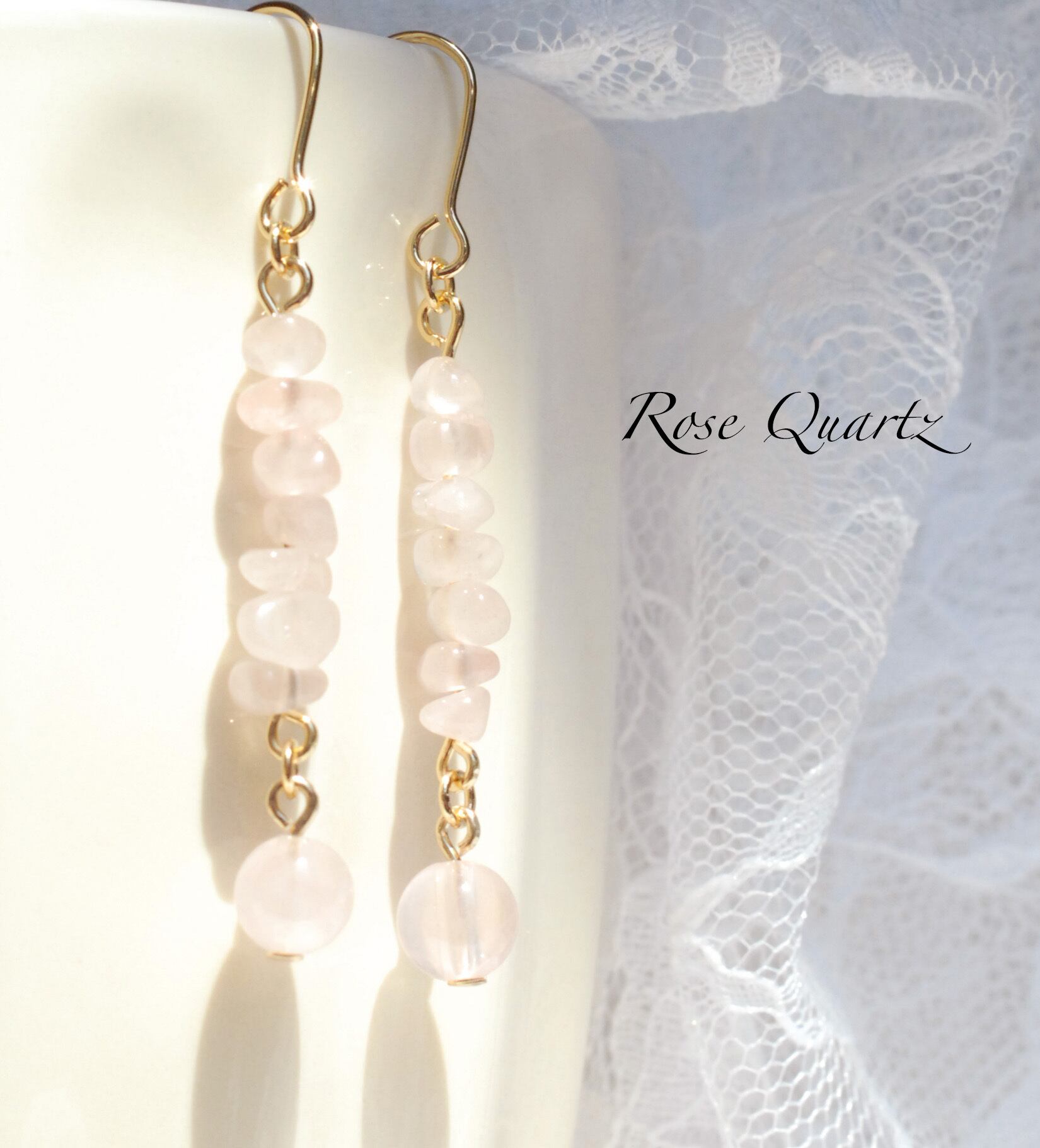 ローズクォーツのさざれ石7つと6㎜玉のローズクォーツを繋げたピアスです。