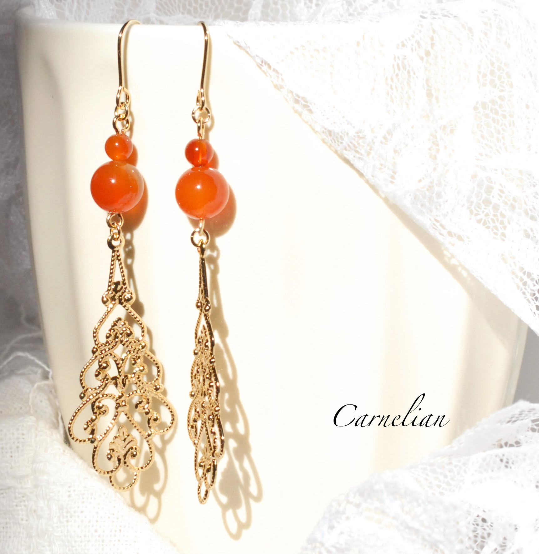 4㎜玉と8㎜玉のカーネリアンに雫型のスカシパーツ(縦約41㎜×横約18㎜/金メッキ)を繋げたピアスです。