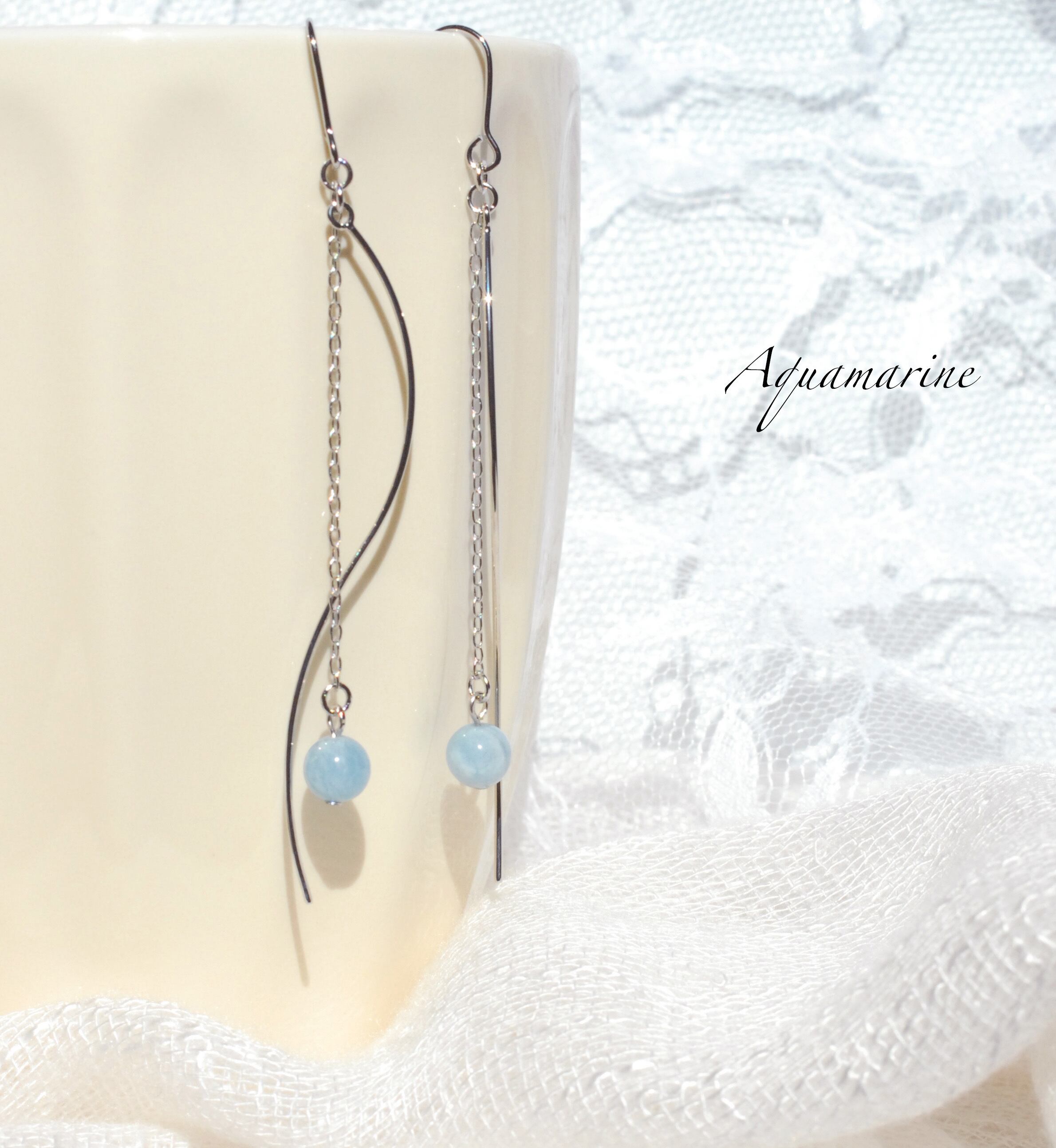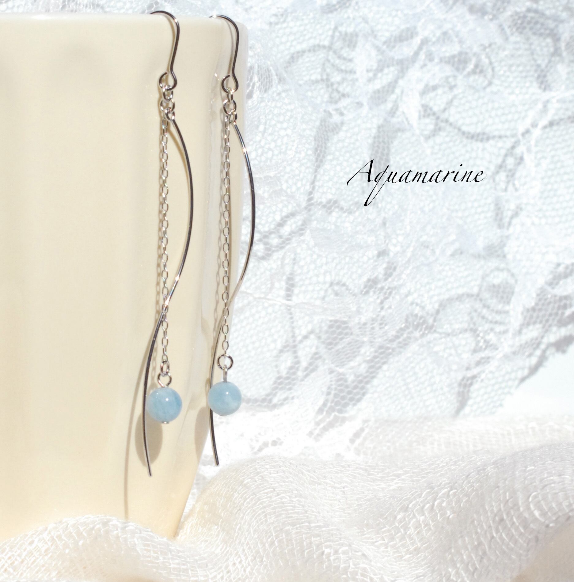 約40㎜のチェーンに6㎜玉のアクアマリンを繋げ、約60㎜の長めのスティックパーツ(銀メッキ)を付けたピアスです。