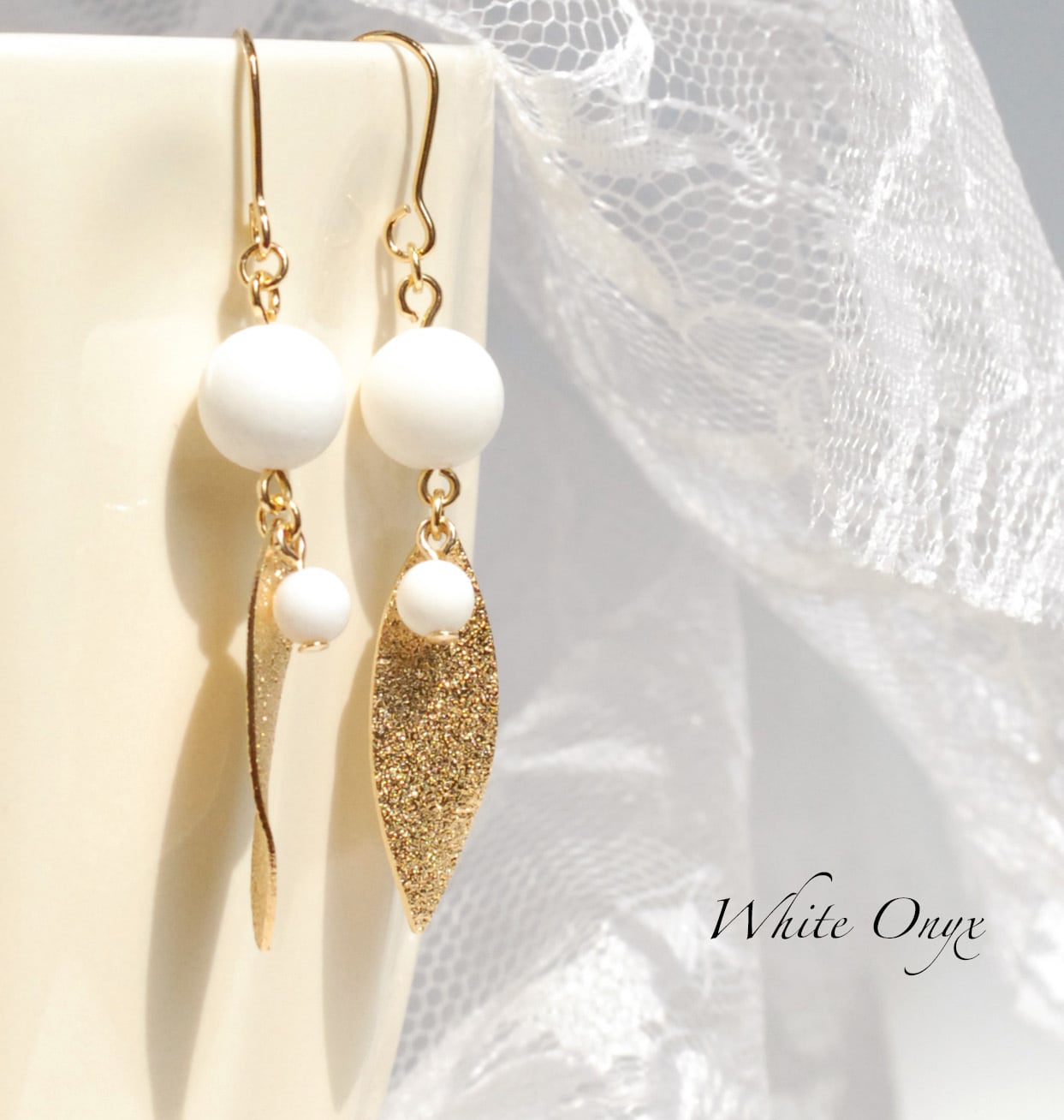 8㎜玉のホワイトオニキスに4㎜玉のホワイトオニキスと葉っぱ型のパーツ(縦約25㎜×横約8㎜/金メッキ)を繋げたピアスです。