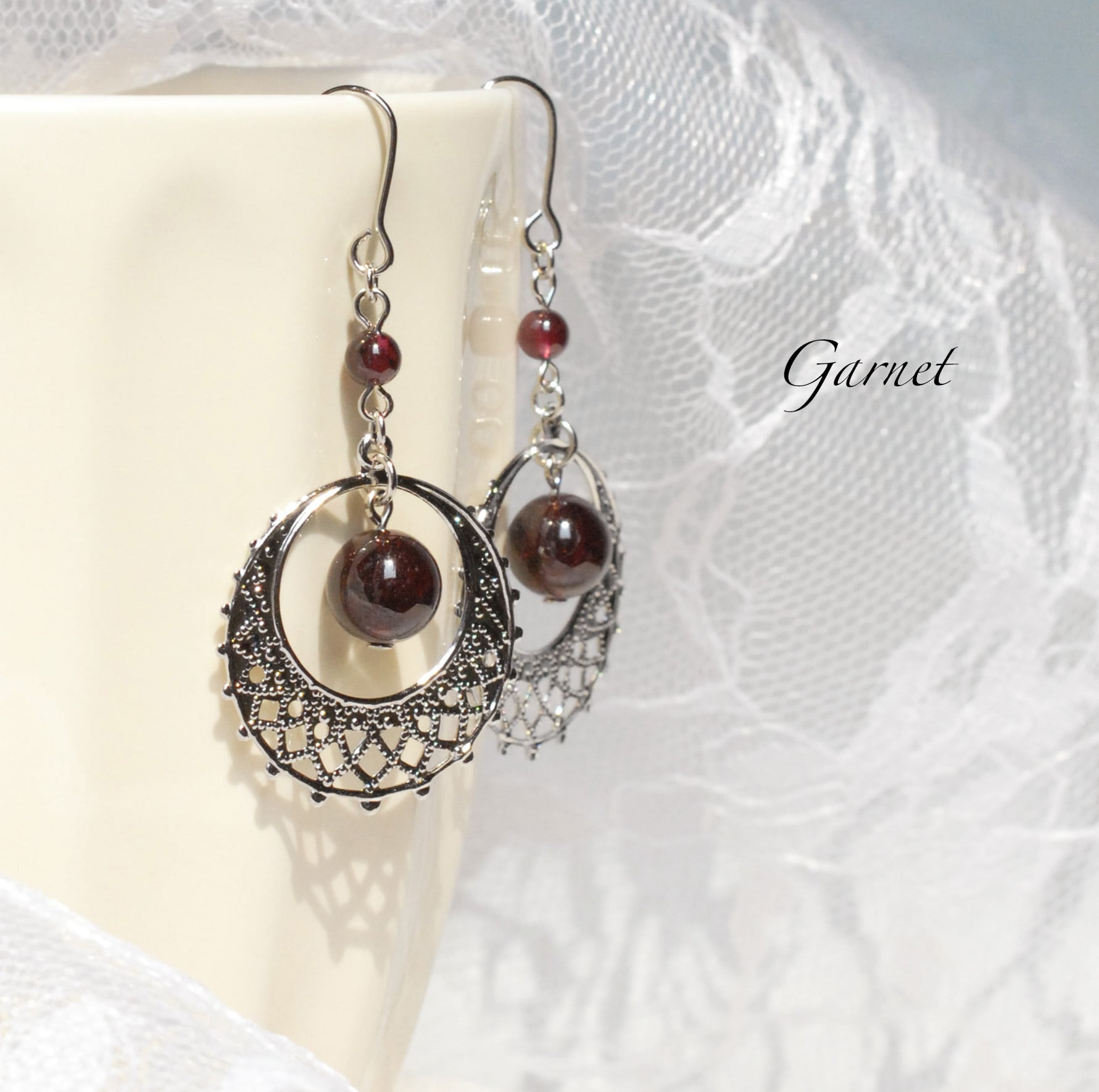 4㎜玉のガーネットに8㎜玉のガーネットとリング型のスカシパーツ(直径約25㎜/銀メッキ)を繋げたピアスです。